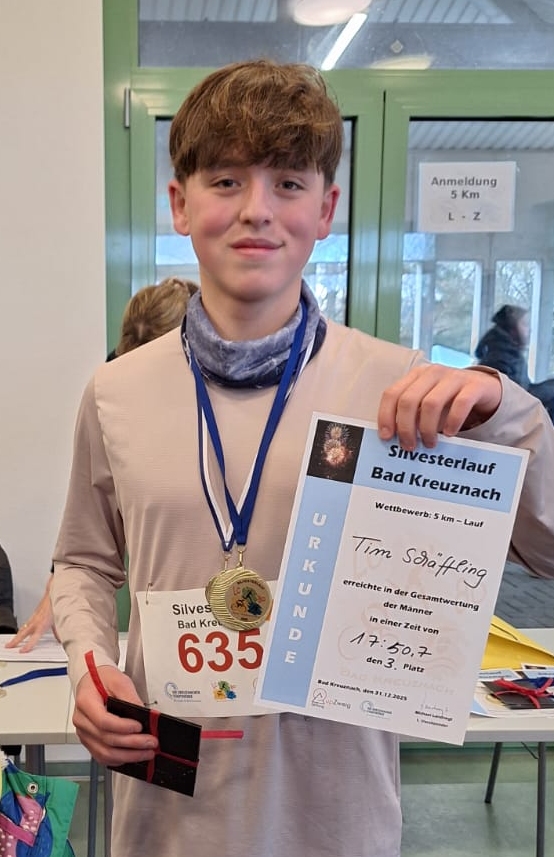Tim Schäffling ging gleich zweimal an den Start. Am Vormittag absolvierte er die 5 km beim Kuhberglauf in Bad Kreuznach und wurde Sieger seiner Altersklasse und Dritter in der Gesamtwertung der Männer. Am Nachmittag ging es dann nach Waldböckelheim zum Silvesterlauf, wo er über die 5 km in einer Zeit von 18:25 Min. die Gesamtwertung der Männer gewann.