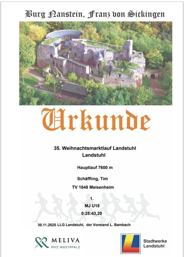 Beim 35. Weihnachtsmarktlauf in Landstuhl konnte Tim Schäffling im Hauptlauf über 7600 m erneut als Erster seiner Altersgruppe MJ U18 nach 25:43 Min. durch das Ziel laufen. Der Vorstand des TV ist stolz auf sein junges Lauftalent.