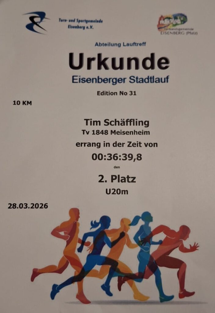 Fast 300 Starter sind bei miesem Wetter beim Stadtlauf in Eisenberg dabei. Das Rennen ist zugleich die Pfalzmeisterschaft. Tim Schäffling konnte sich in der Altersklasse U20m in 36:39,8 Min. einen sehr guten 2. Platz über die 10 km-Distanz sichern.