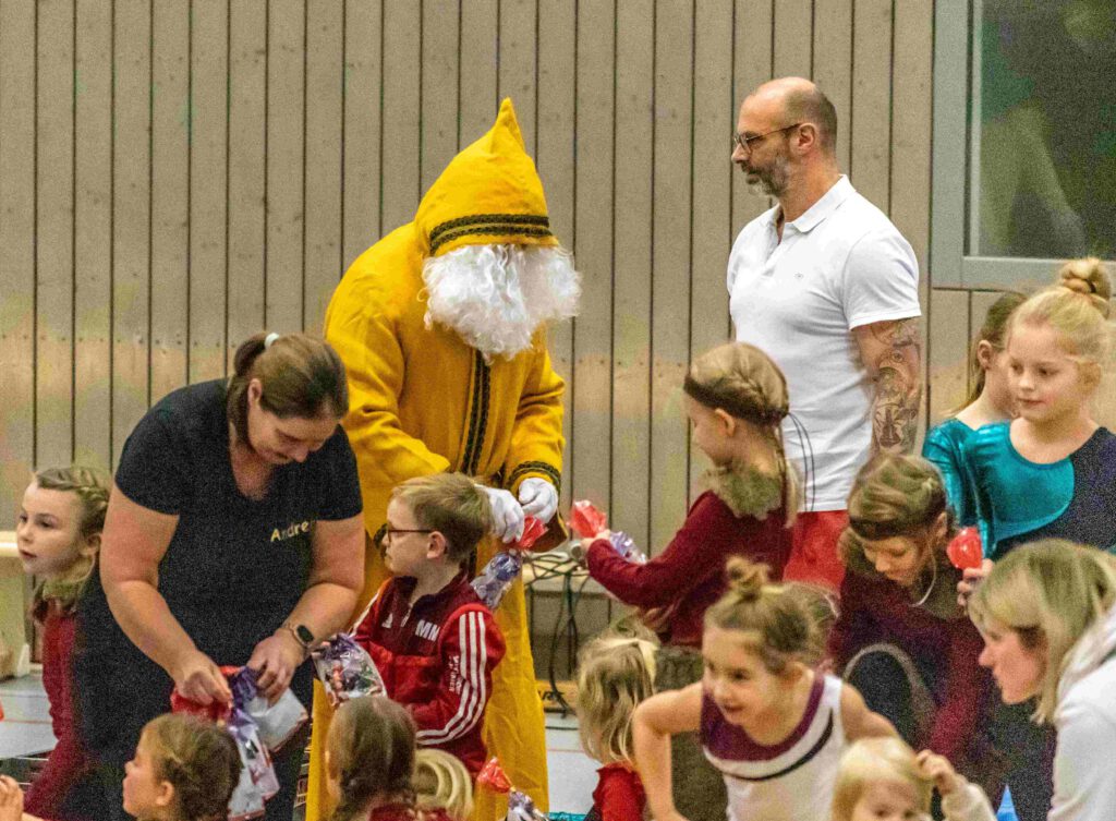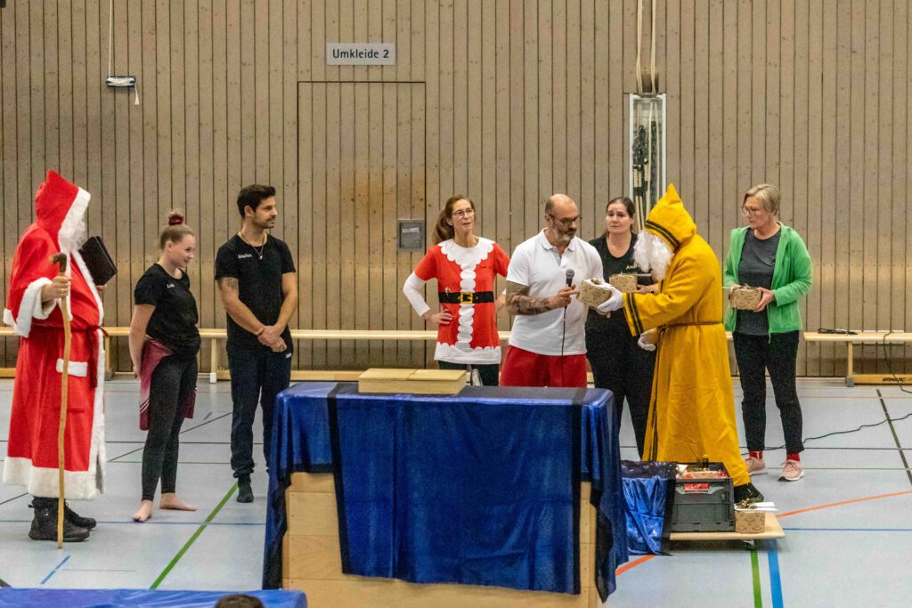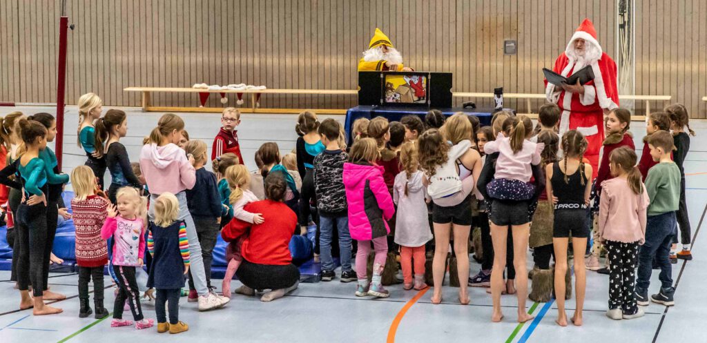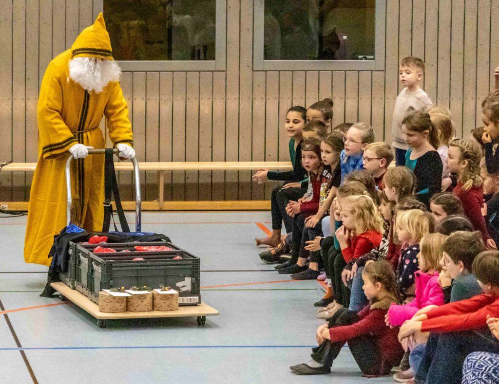 Dann wurde es ganz laut in der Halle: Der Nikolaus hatte sein Erscheinen angekündigt, war aber noch nicht eingetroffen. Das Rufen blieb schließlich nicht ungehört, und der Nikolaus mit seinem Knecht Rupprecht betraten die Turnhalle. Mit dem Kamishibai-Theater brachte der Nikolaus den Kindern eine Geschichte vom kleinen Weihnachtsmann näher. Aber der Nikolaus war nicht mit leeren Händen gekommen. So gab es zum Abschluss für alle beteiligten Übungsleiterinnen und Übungsleiter und die Kinder eine kleine Überraschung.